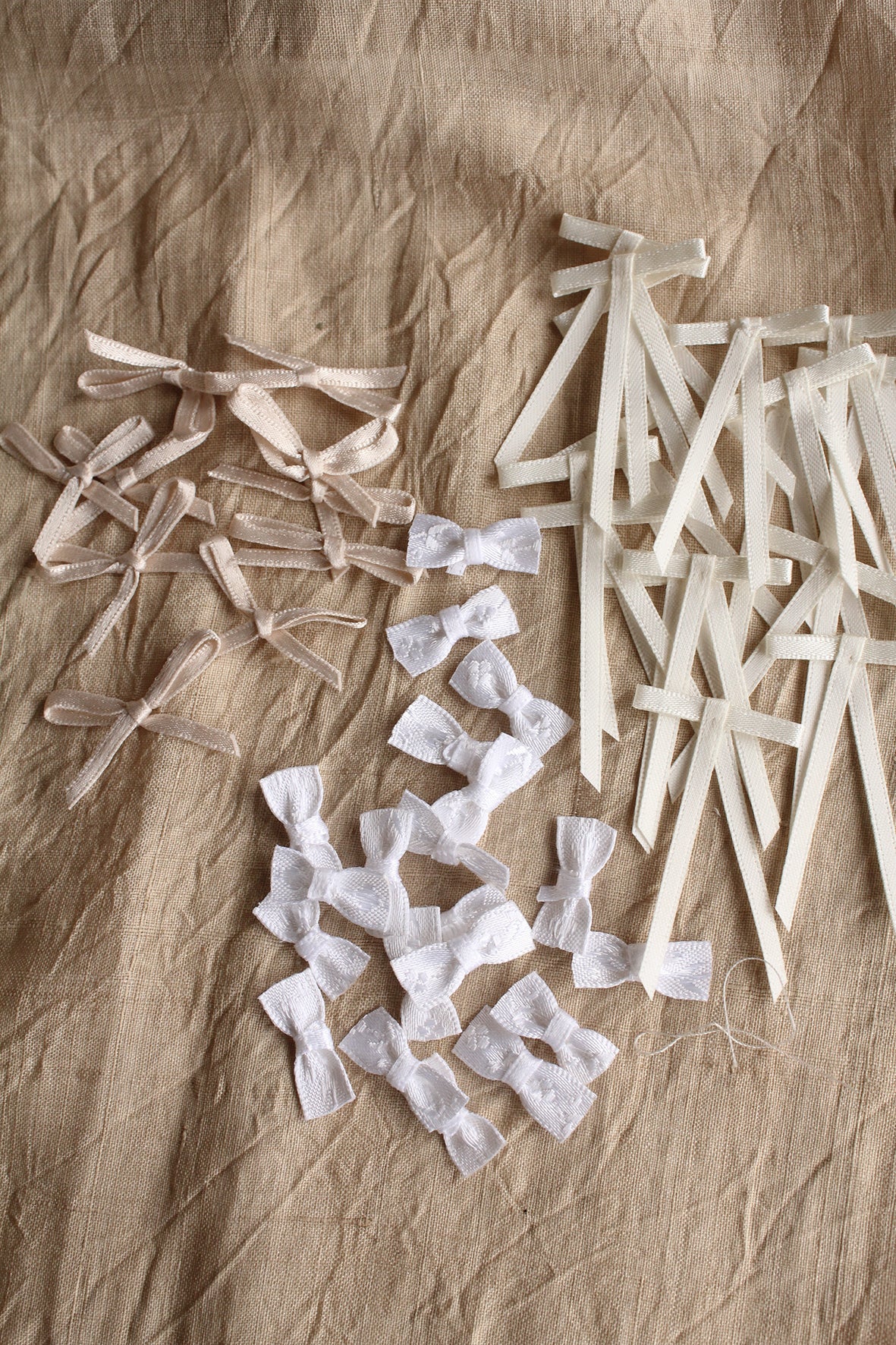 A collection of 45 miniature ribbon bows from an old haberdashery shop that closed some time ago. Perfect for journaling, slow stitching and other project work.