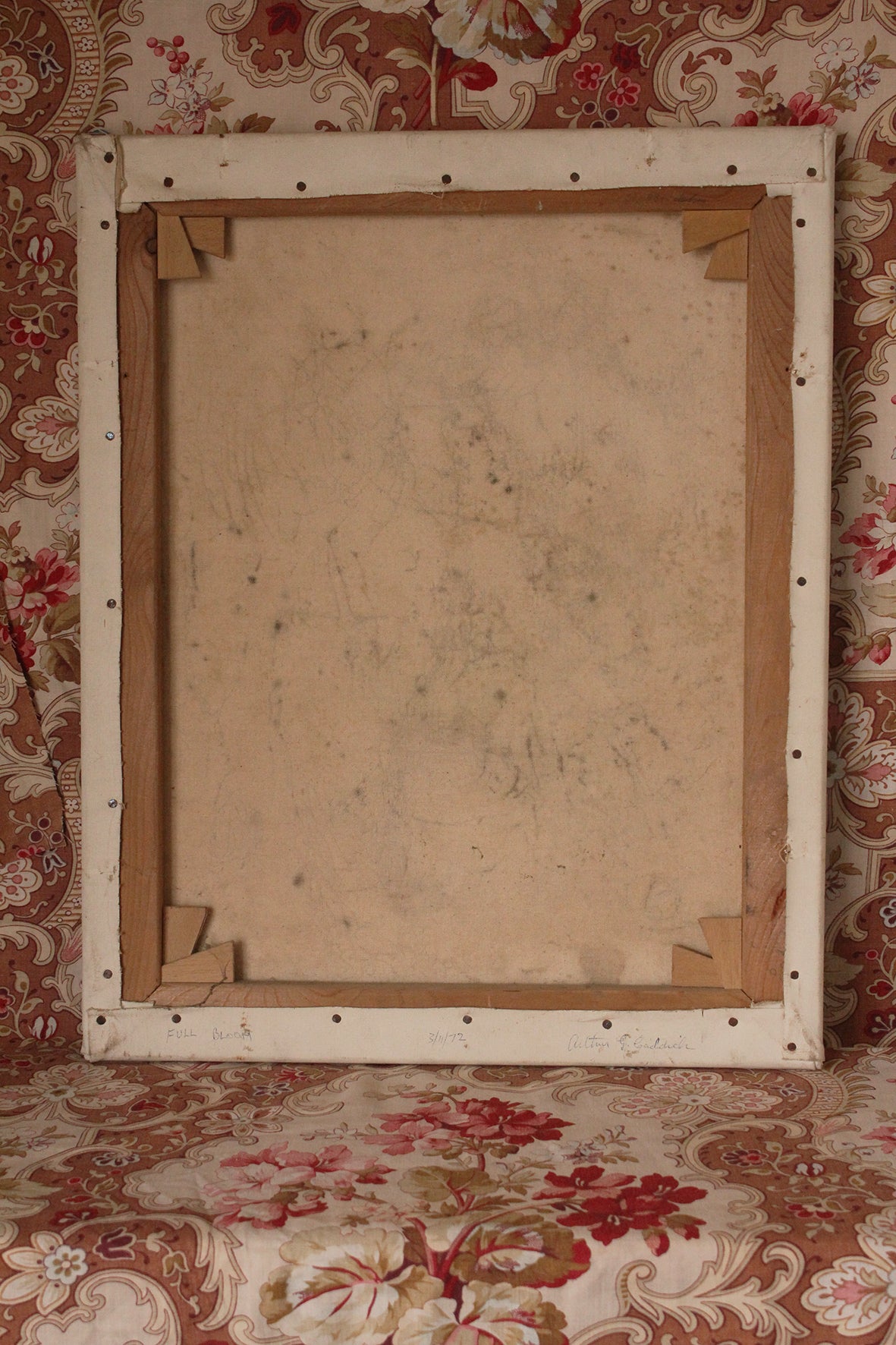 The artist has signed the reverse of the canvas near to the wooden frame and the painting is titled 'Full Blooms@ and painted in 1972 by Arthur G Caddick