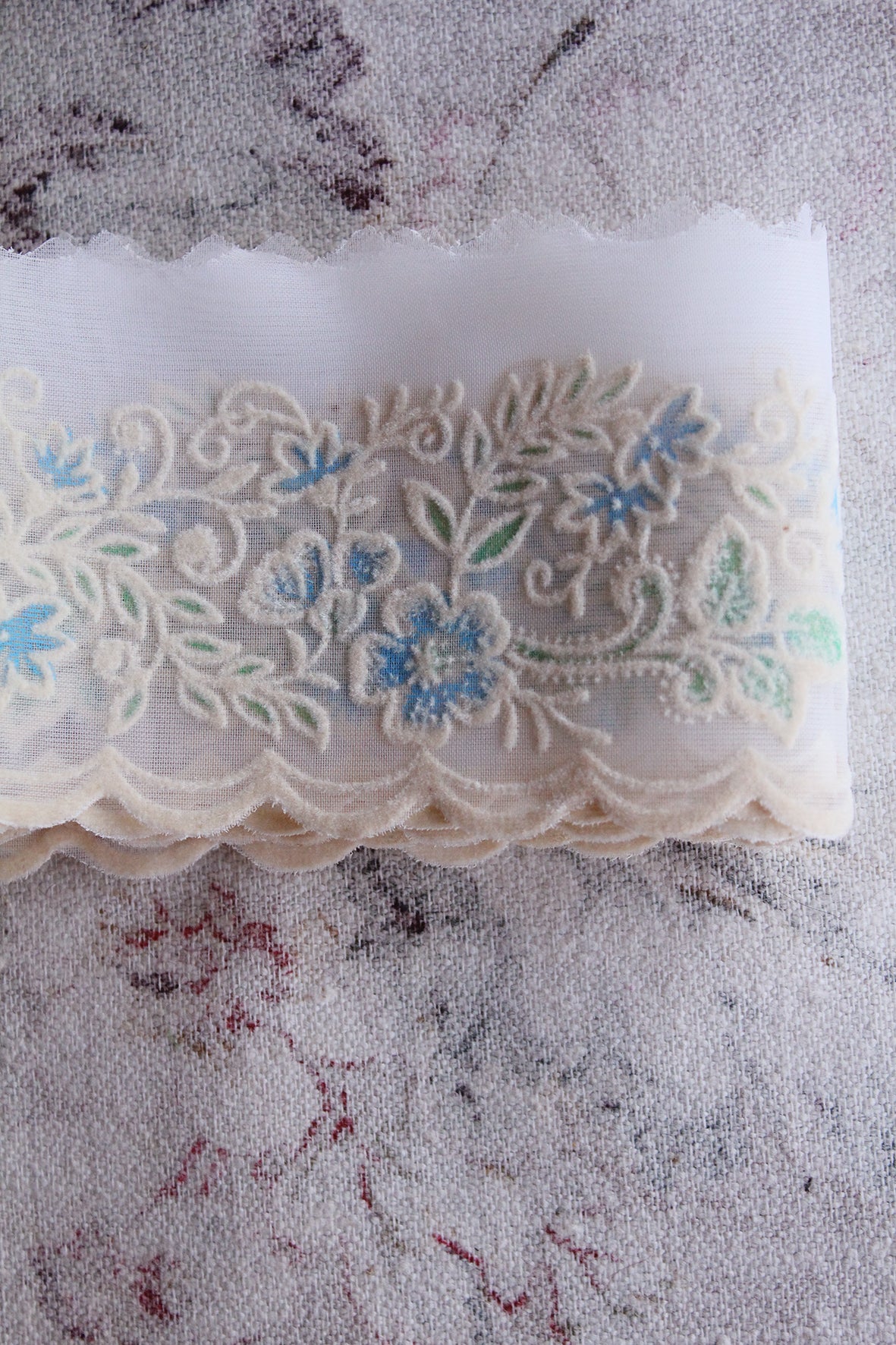 A length of vintage synthetic printed edging that is detailed with a soft latex(ish) lace design.