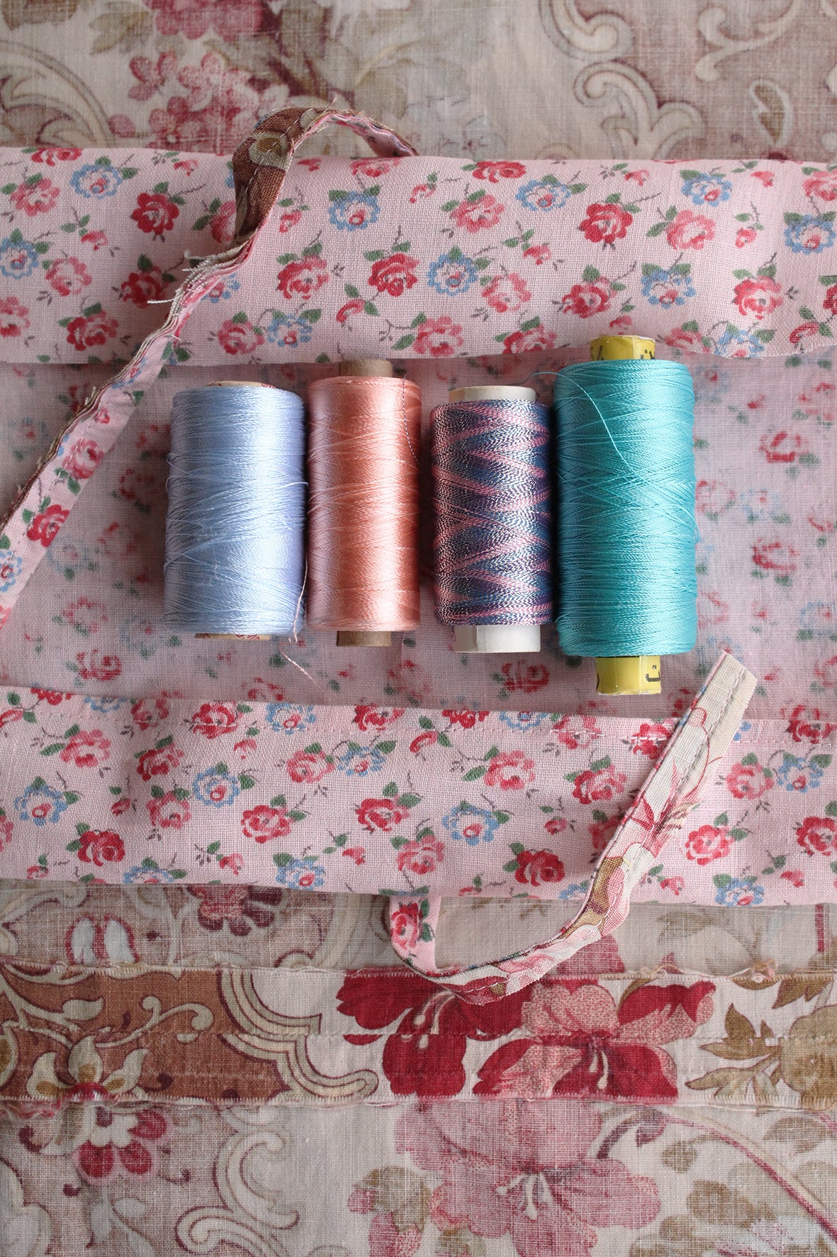 A vintage French ditsy rose printed cotton panel that wraps around 4 vintage viscose reels of thread (faux silk) in beautiful colours. This thread is lovely for hand embroidery.