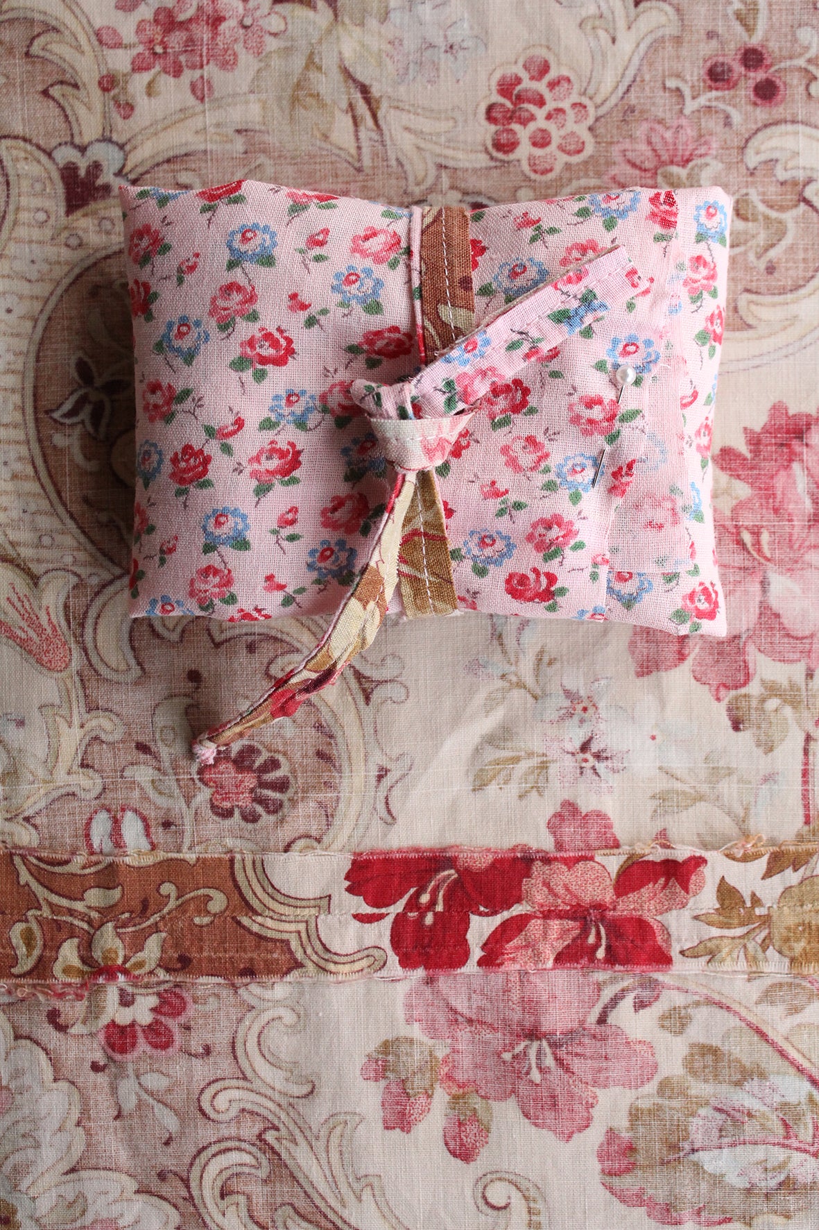 The wrap is then tied with an old reclaimed seam length and finished with a pearl pin.
