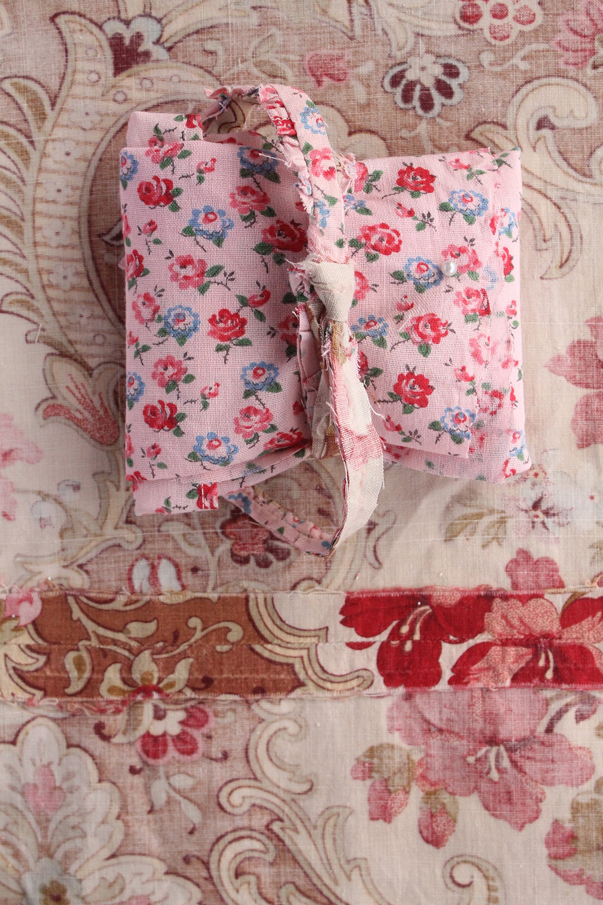 A vintage French ditsy rose printed cotton panel that wraps around 4 vintage viscose reels of thread (faux silk) in beautiful colours. This thread is lovely for hand embroidery.